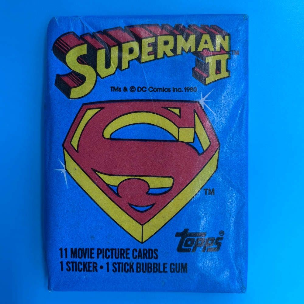 Superman II trading card packet released by Topps in 1980. Includes 11 movie picture cards, 1 sticker, and 1 stick of bubble gum per pack.