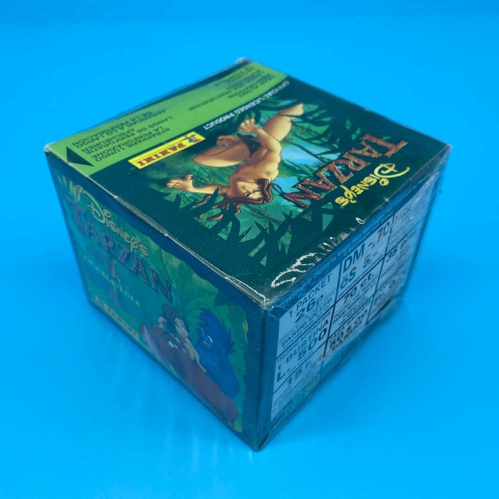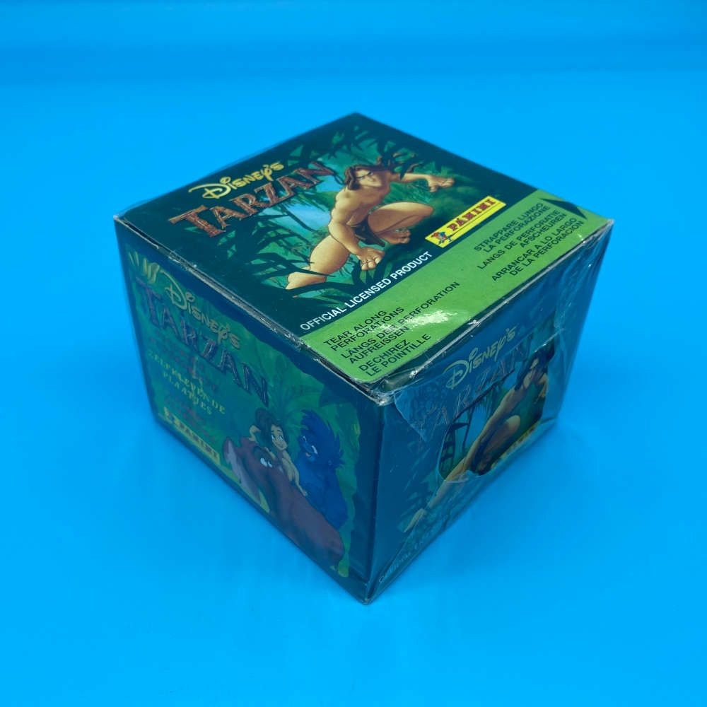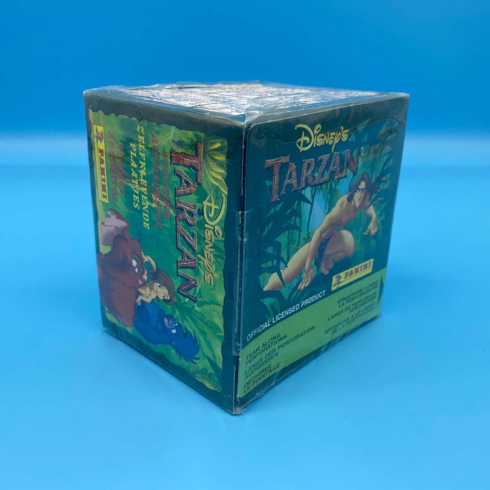 Disney’s Tarzan sticker box by Panini. Includes 50 sealed packets featuring characters and scenes from the animated film. Officially licensed product with rights from Edgar Rice Burroughs, Inc. and Disney. Box remains factory sealed.