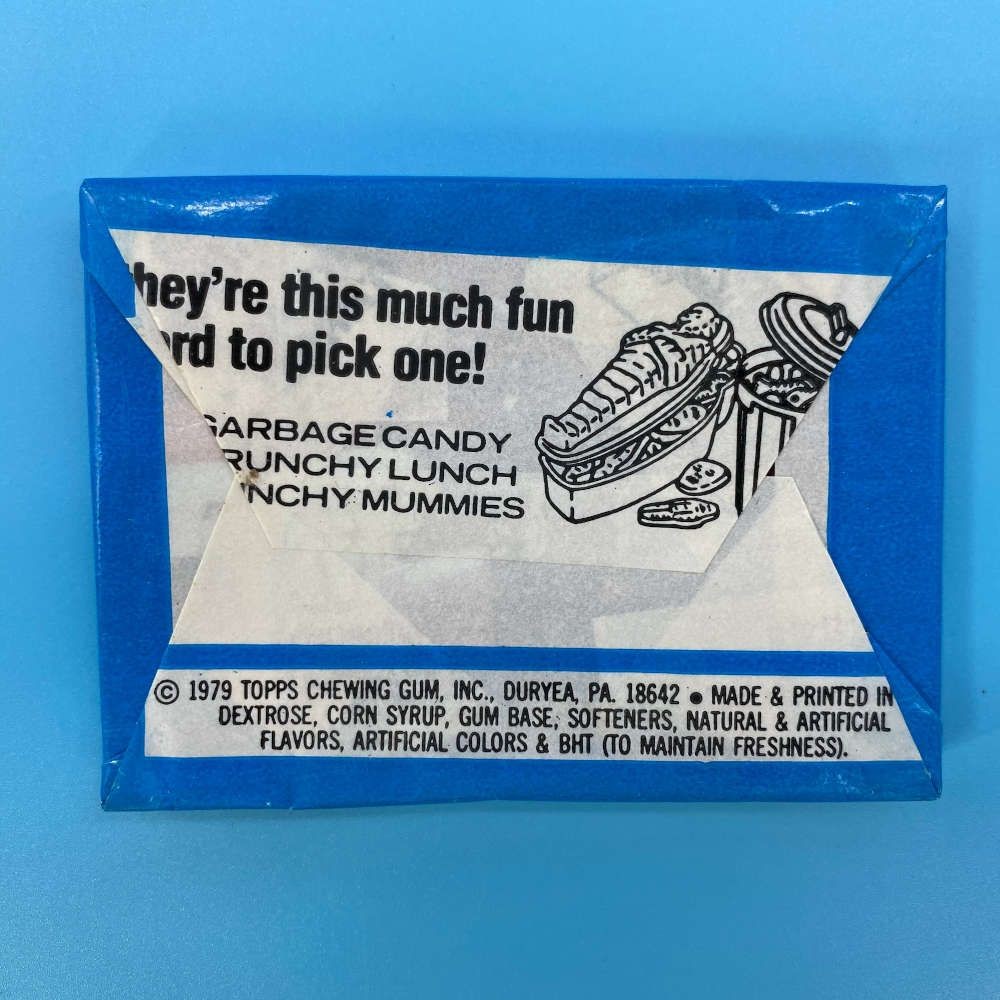 This officially licensed The Black Hole trading card packet was released by Topps in 1979 to coincide with the Walt Disney sci-fi film. Each vintage wax pack contains 10 movie photo cards, 1 sticker, and 1 stick of bubble gum. The packet features a single front wrapper design, with two different promotional adverts randomly printed on the reverse. The cards showcase scenes, characters, and spacecraft from Disney’s first PG-rated film, set aboard the U.S.S. Cygnus near a mysterious black hole.