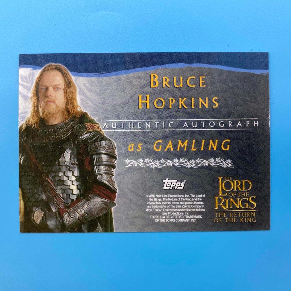 Authentic autograph card from The Lord of the Rings: The Return of the King trading card series by Topps, released in 2003. This insert features Bruce Hopkins as Gamling, captain of the Rohan army, with his blue ink signature on the front. The card showcases the iconic One Ring motif and film logo, and belongs to the official autograph subset highlighting principal and supporting characters from the final film in the trilogy.