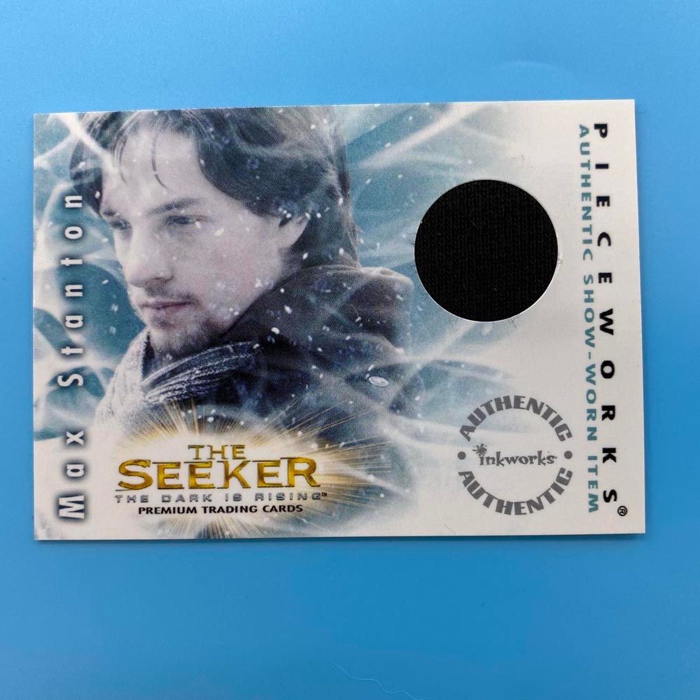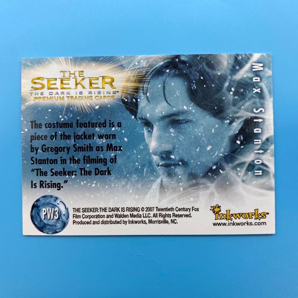 This officially licensed costume card was released by Inkworks in 2007 as part of The Seeker: The Dark Is Rising trading card set. Card PW3 includes a swatch of authentic dark brown jacket fabric worn by Gregory Smith portraying Max Stanton during filming. This screen-used piece is embedded within the card, offering collectors a direct connection to the film’s costume design and character portrayal.