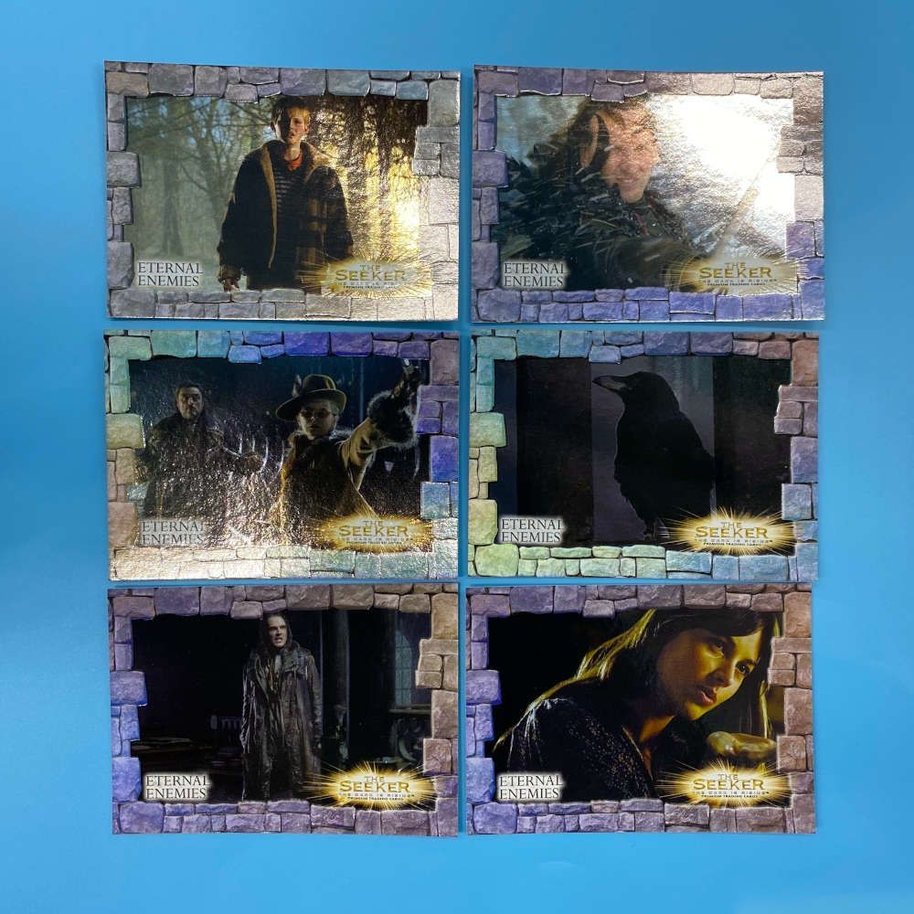 This officially licensed 6-card insert set from The Seeker: The Dark Is Rising was released by Inkworks in 2007. Titled Eternal Enemies, the set includes cards E1 through E6, each spotlighting antagonists and dark entities from the film. With a stone-border design and foil finish, the cards feature scenes and character portraits representing the forces of darkness that oppose the protagonist Will Stanton. This set was issued as a premium insert for collectors of the official movie card series.
