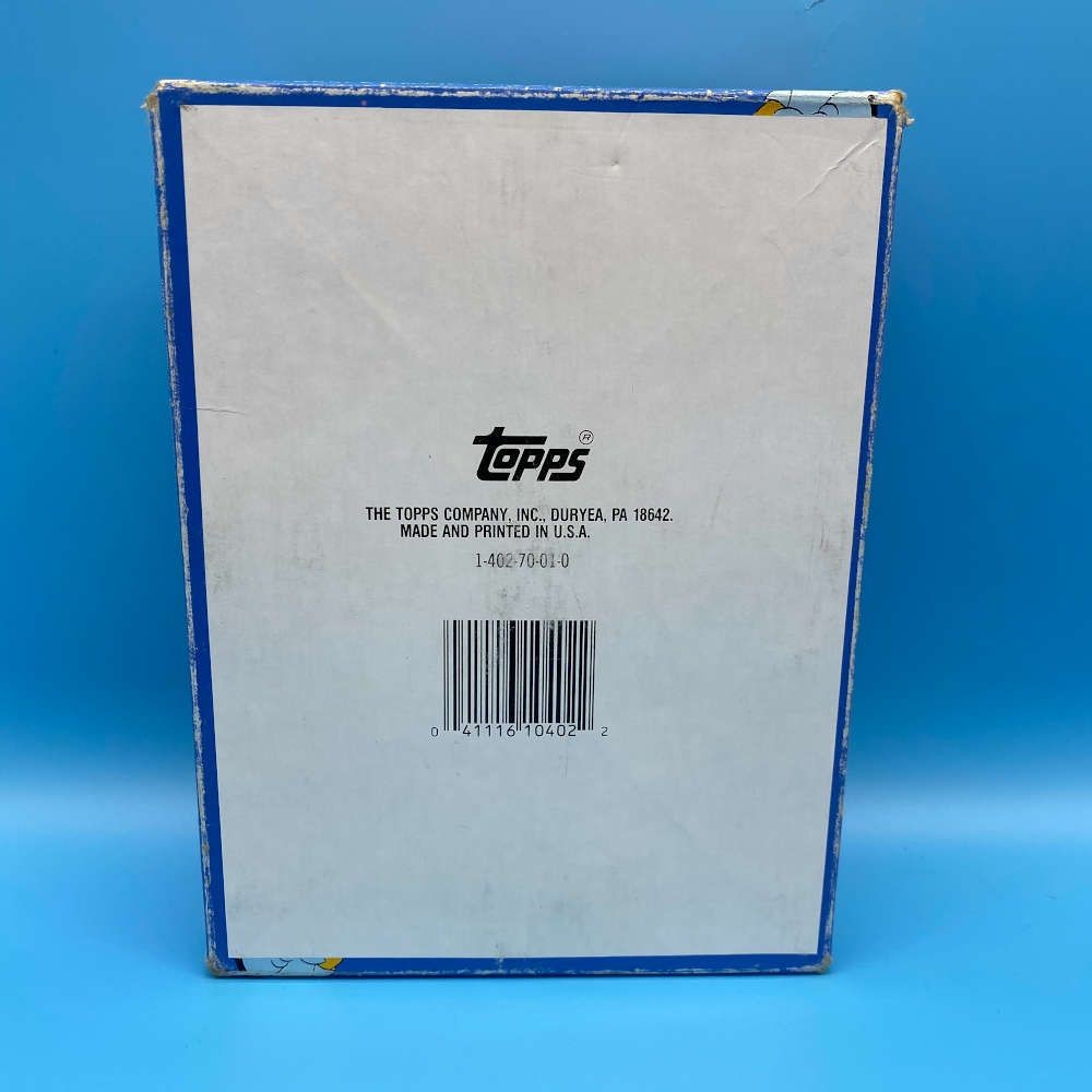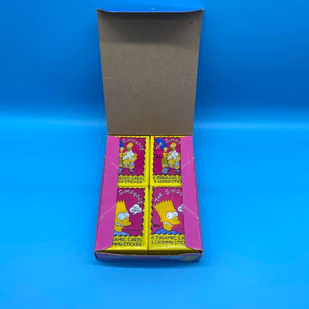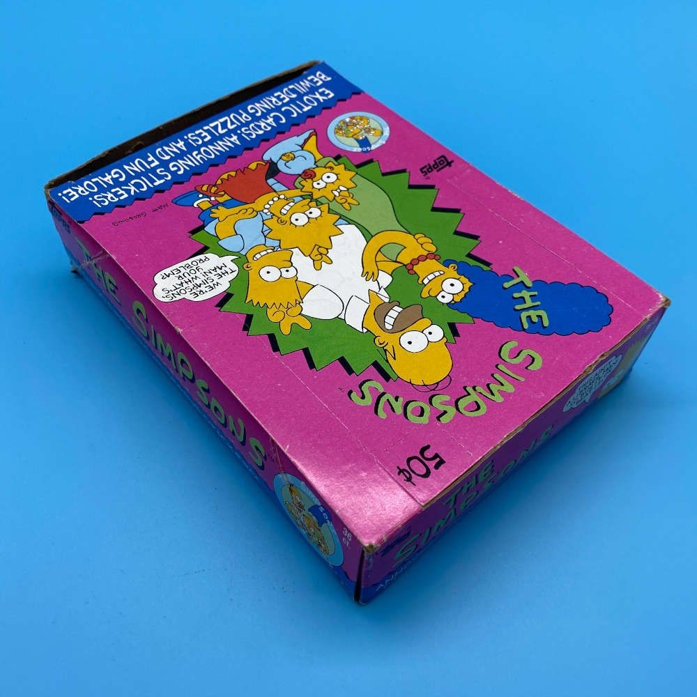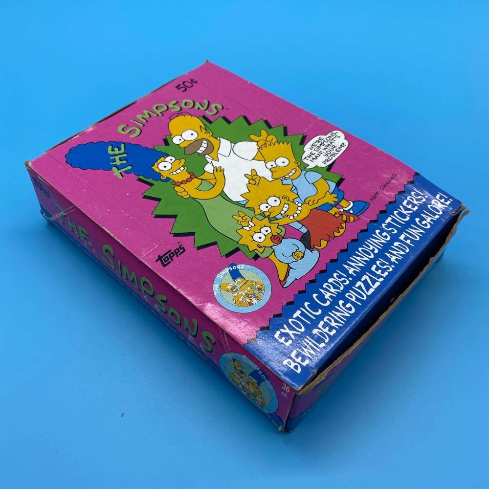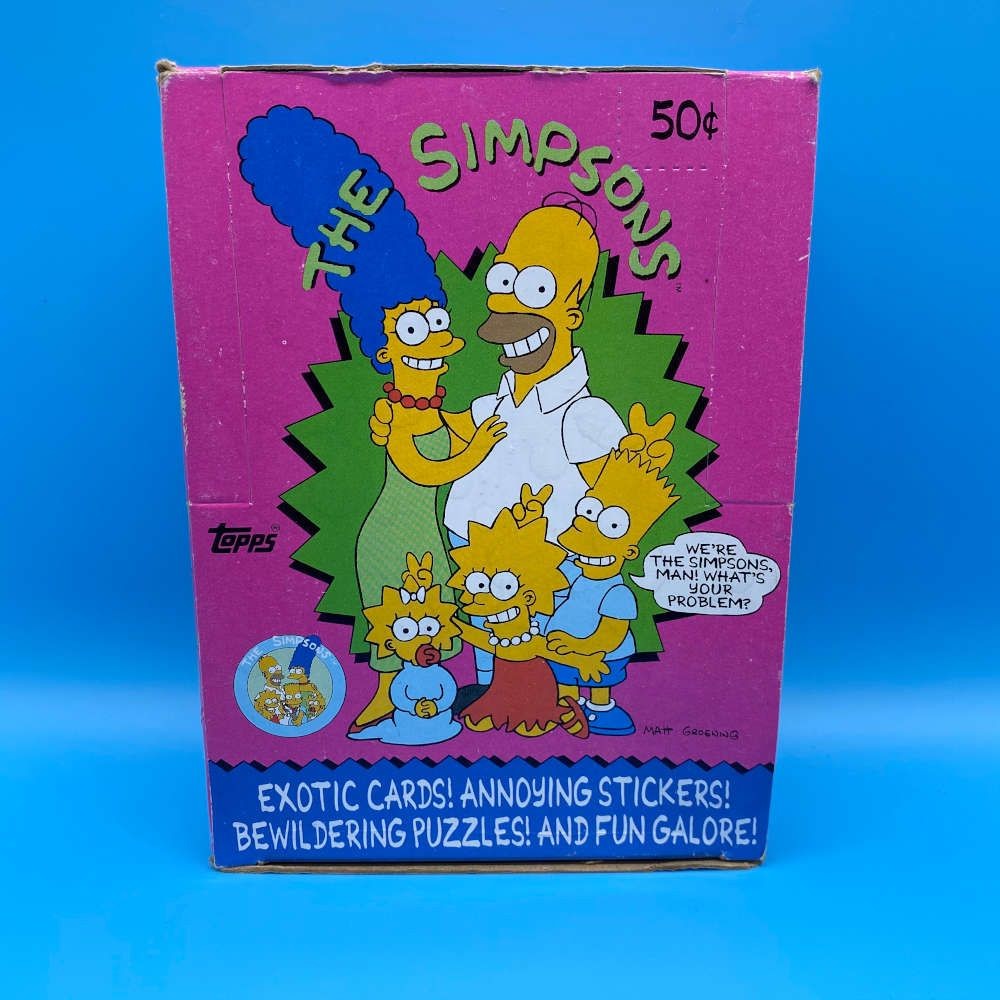 The Simpsons trading cards box by Topps (1990). Includes 36 packs with 8 cards and 1 sticker each. Features puzzles, gags, and scenes from the hit animated series.