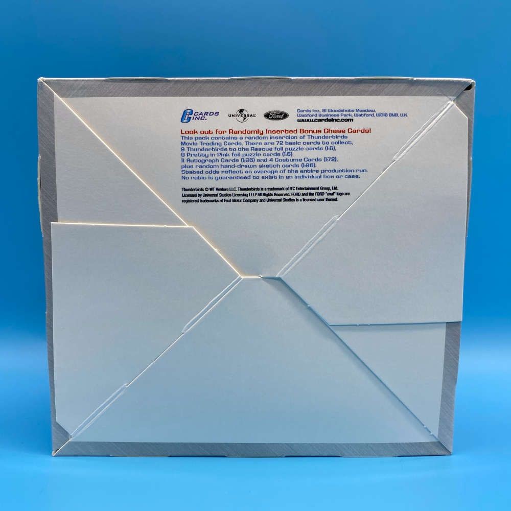 Trading card box from the Thunderbirds Are Go movie set released by Cards Inc. Contains 36 packets with 6 cards per pack. Chase cards include Thunderbirds to the Rescue foil puzzle cards, Pretty in Pink foil puzzle cards, autograph cards, costume cards, and hand-drawn sketch cards. Officially licensed by Universal. Please note: boxes were not originally factory sealed.