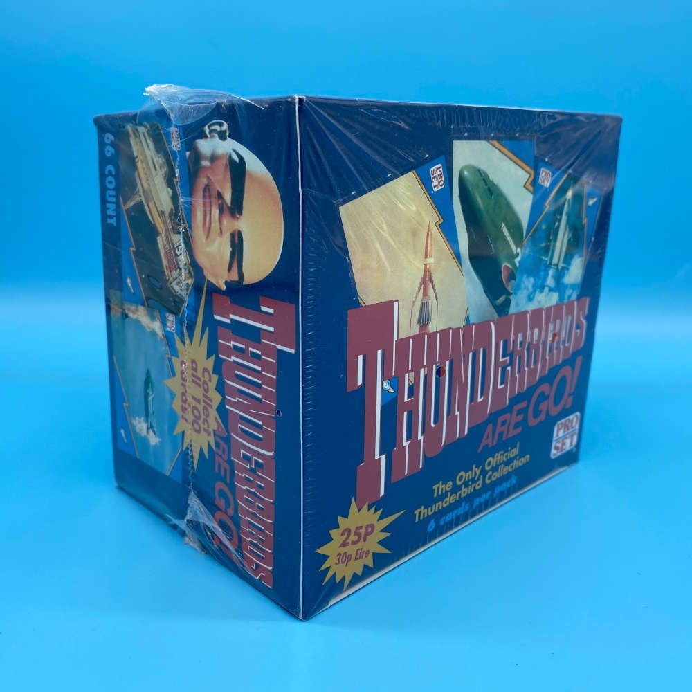 Thunderbirds Are Go trading card box by Pro Set (1992). Includes 66 packs of 6 cards each. Features 100-card set with scenes and facts from the original TV series.