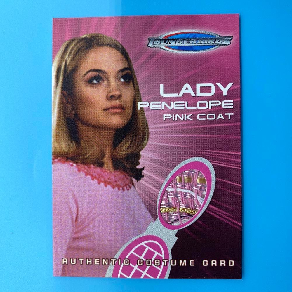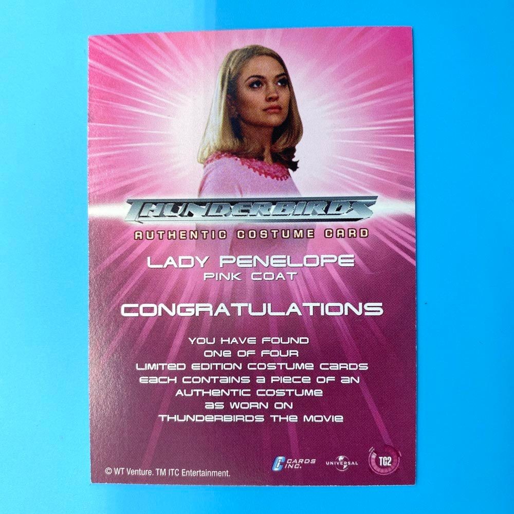 This officially licensed Thunderbirds The Movie costume card contains a piece of authentic pink coat fabric worn by Lady Penelope in the film. Manufactured by Cards Inc in 2004, this card (TC2) is one of four limited edition costume cards released for Thunderbirds The Movie.