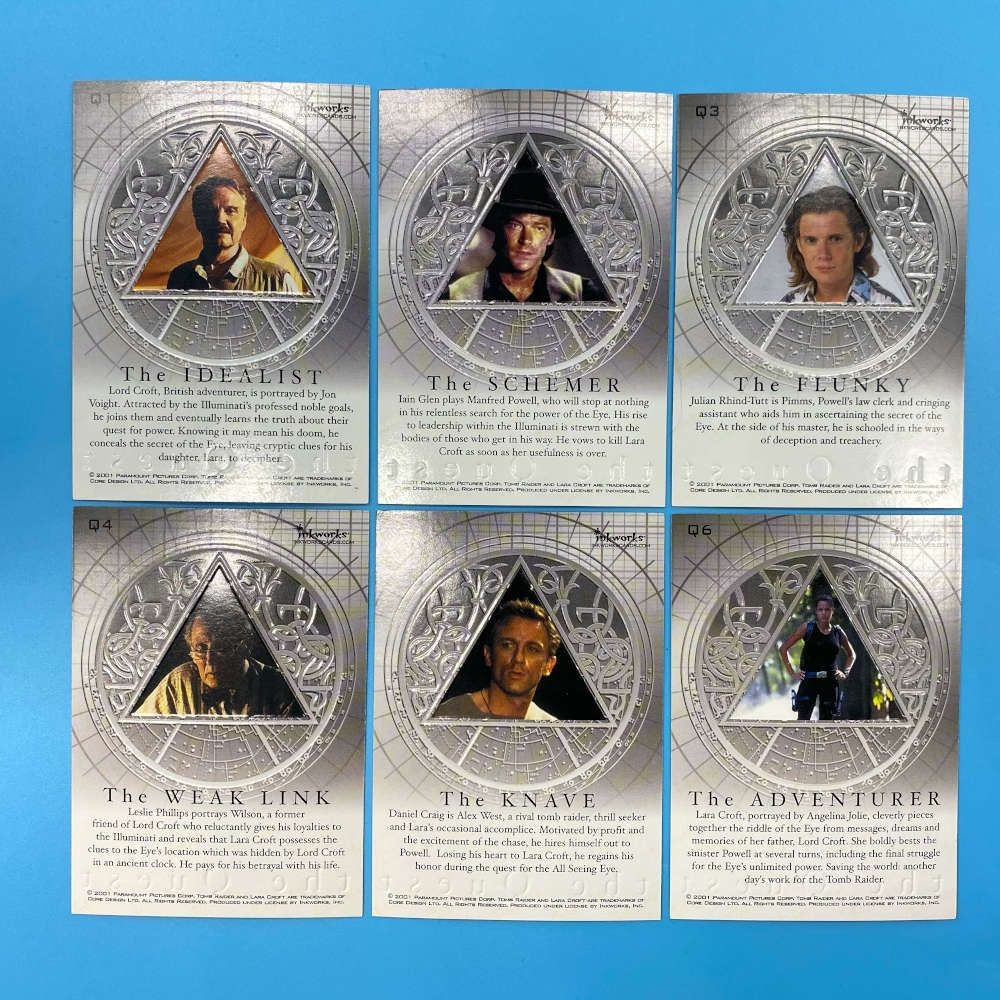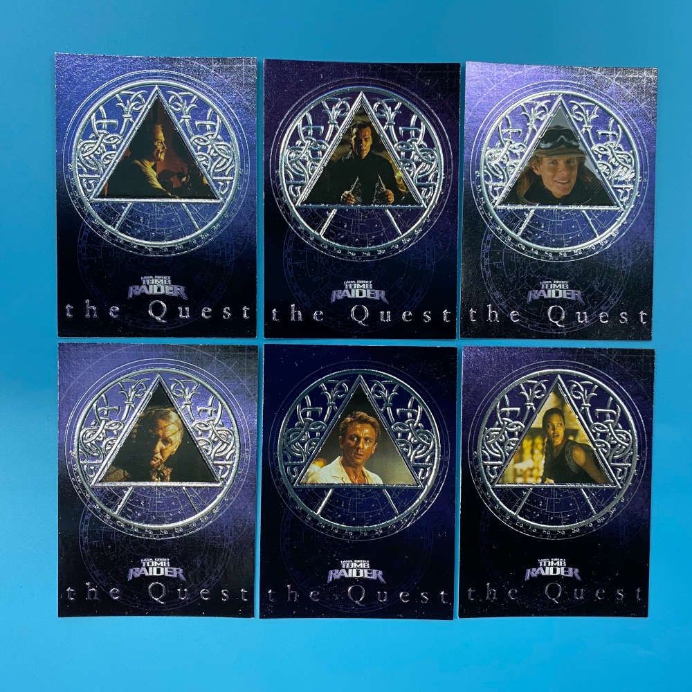 Tomb Raider The Movie The Quest chase card set by Inkworks (2001). Includes all 6 foil-stamped cards Q1 to Q6 featuring key characters and scenes from the film.