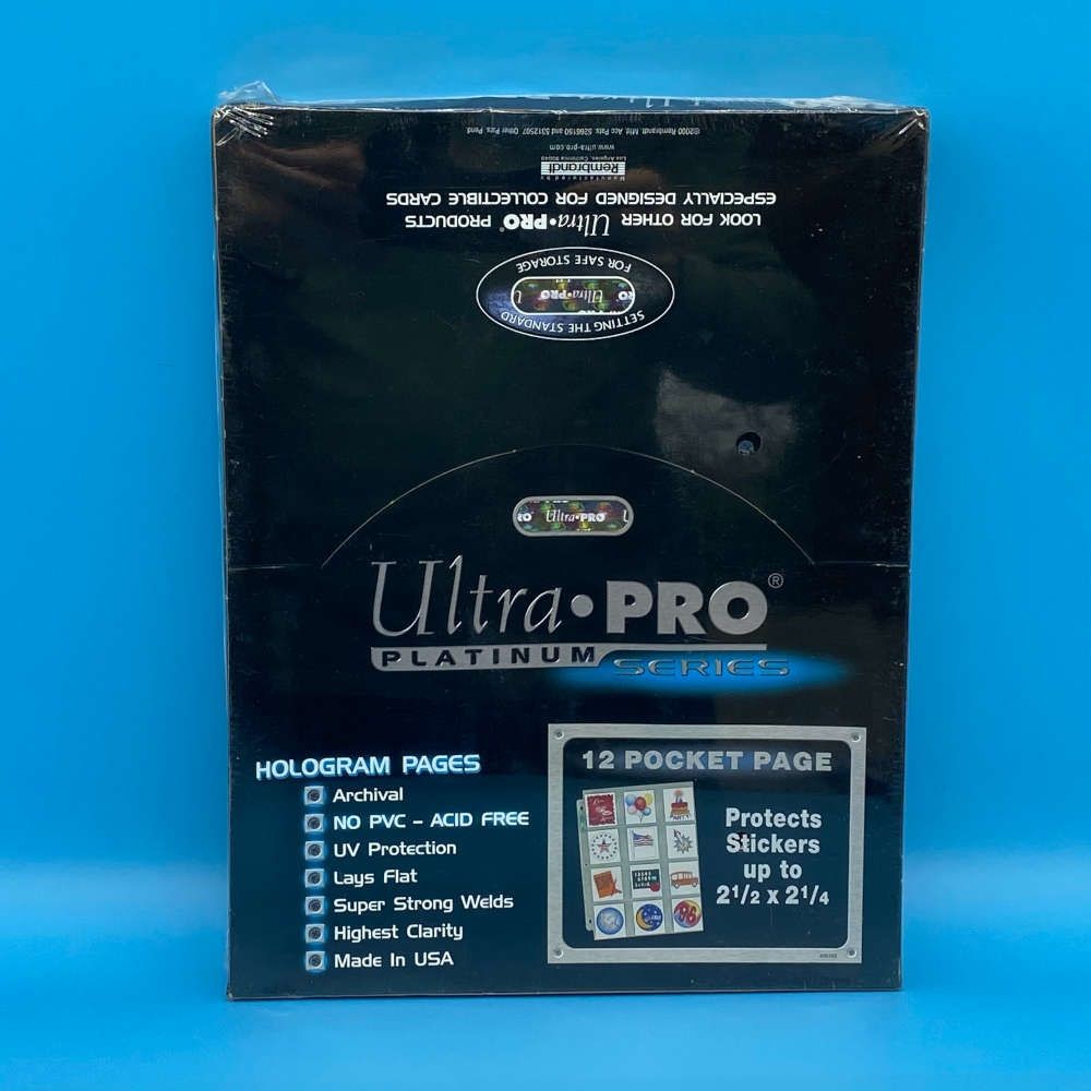 Ultra Pro Platinum Series 12-pocket pages box with 100 archival-safe sheets. Protects items up to 2½" x 2¼" with ultra-clear, acid-free materials.