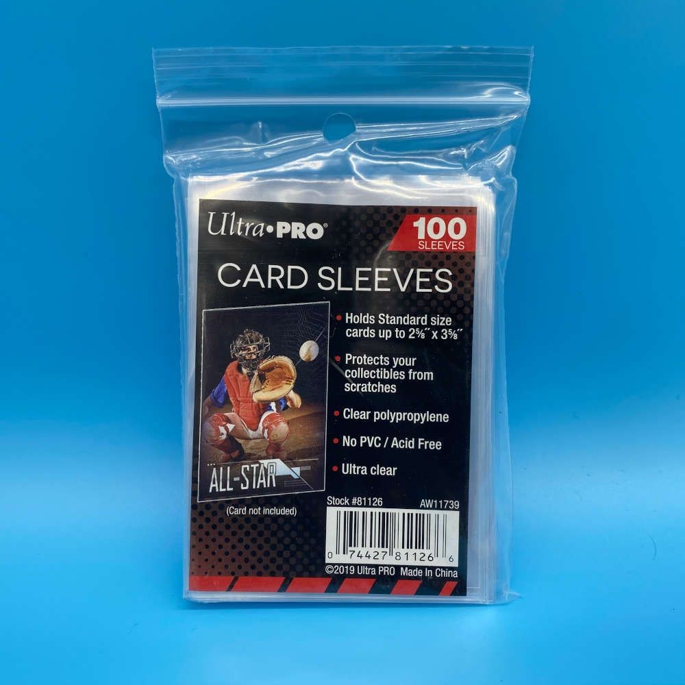 Packet of 100 Ultra Pro card sleeves designed to hold standard trading cards up to 2 5/8" x 3 5/8". Manufactured using ultra-clear polypropylene that is acid-free and contains no PVC. Provides long-term protection from dust, fingerprints, and scratches. Ideal for sports, gaming, and non-sport trading cards.