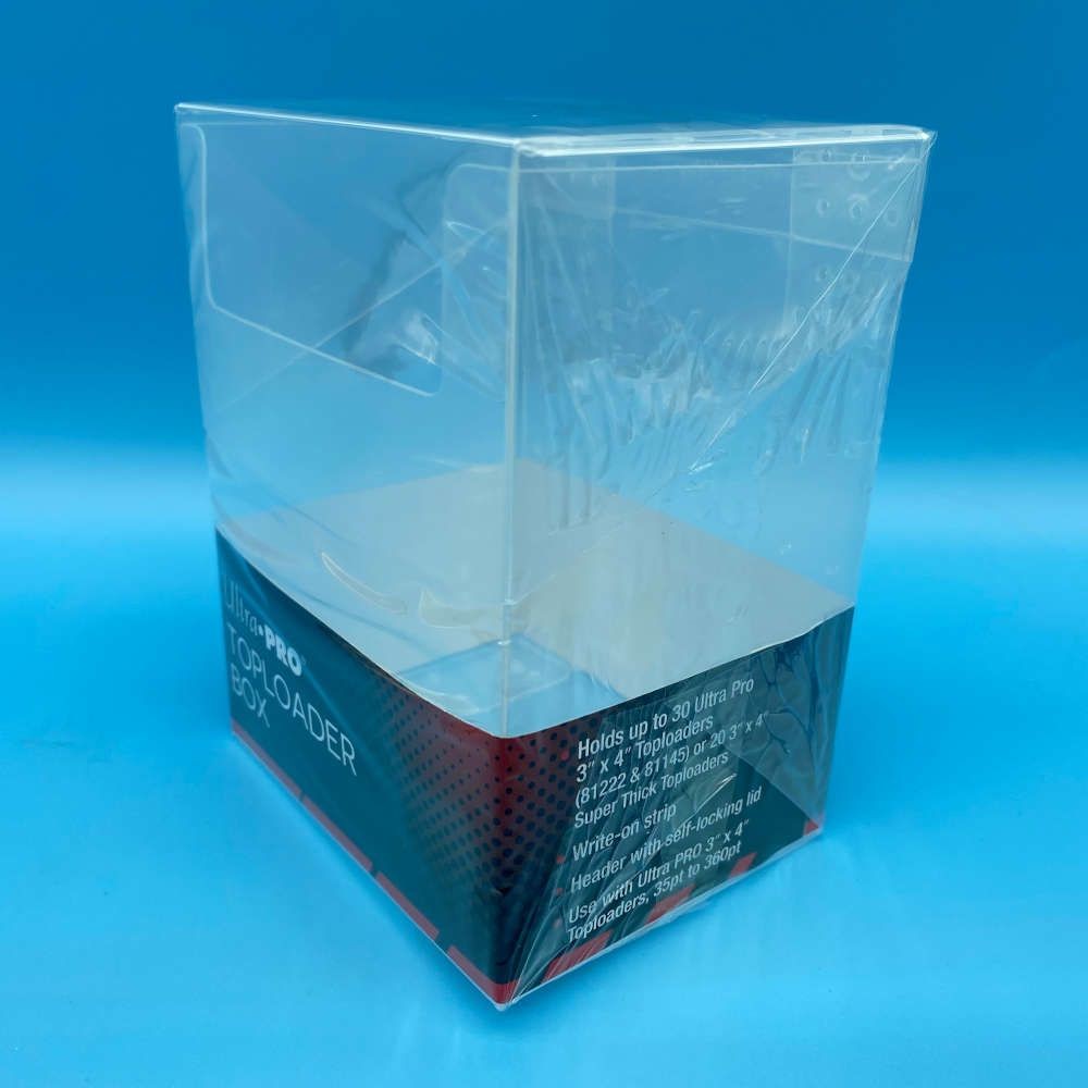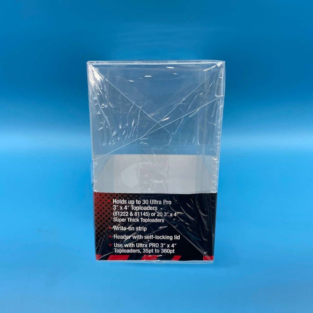 Ultra Pro Toploader Storage Box holds up to 30 standard or 20 super thick 3" x 4" toploaders. Includes write-on strip and locking lid. Designed for 35pt–360pt cards.