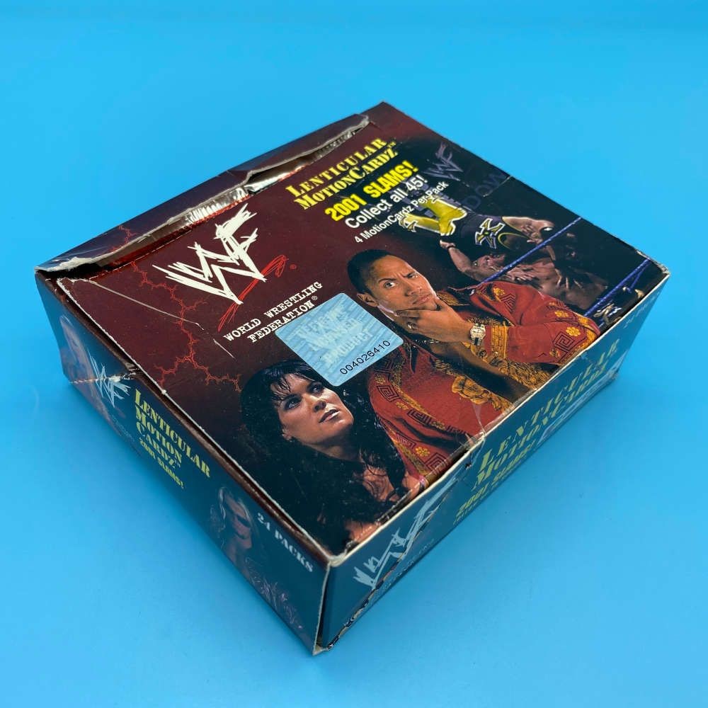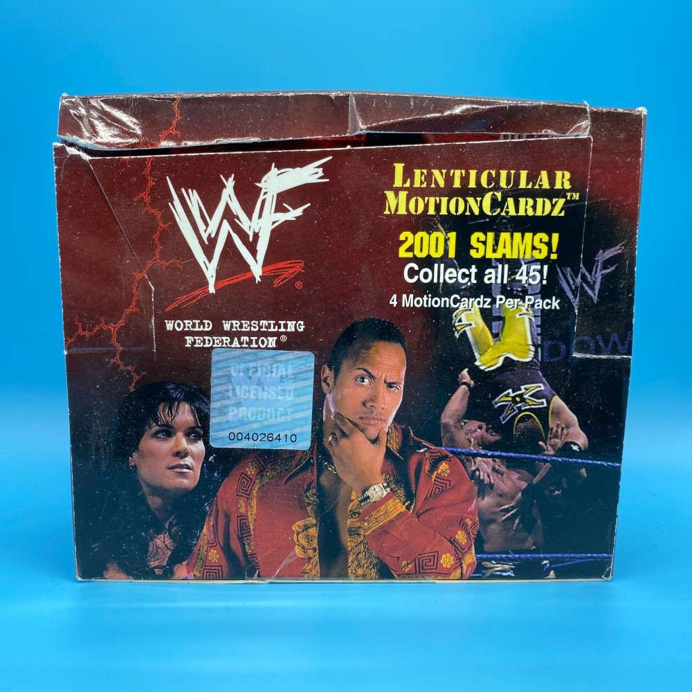 WWF Lenticular MotionCardz 2001 Slams box by Artbox (2001). Includes 24 packs of 4 motion cards. Box is ripped, but all internal packets are intact.