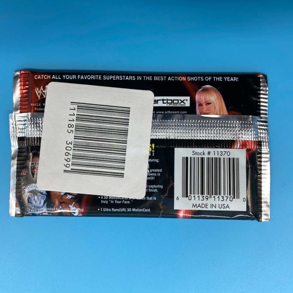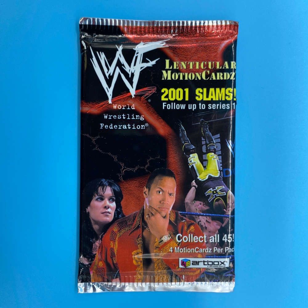 This single packet is from the WWF Lenticular Motion Cardz: 2001 Slams! series released by Artbox in 2001. Each pack contains 4 lenticular motion cards featuring dynamic action shots of WWF superstars including The Rock, Chyna, and others. The full set includes 45 cards with rare inserts. Some packets may include barcode stickers on the back (see photos).