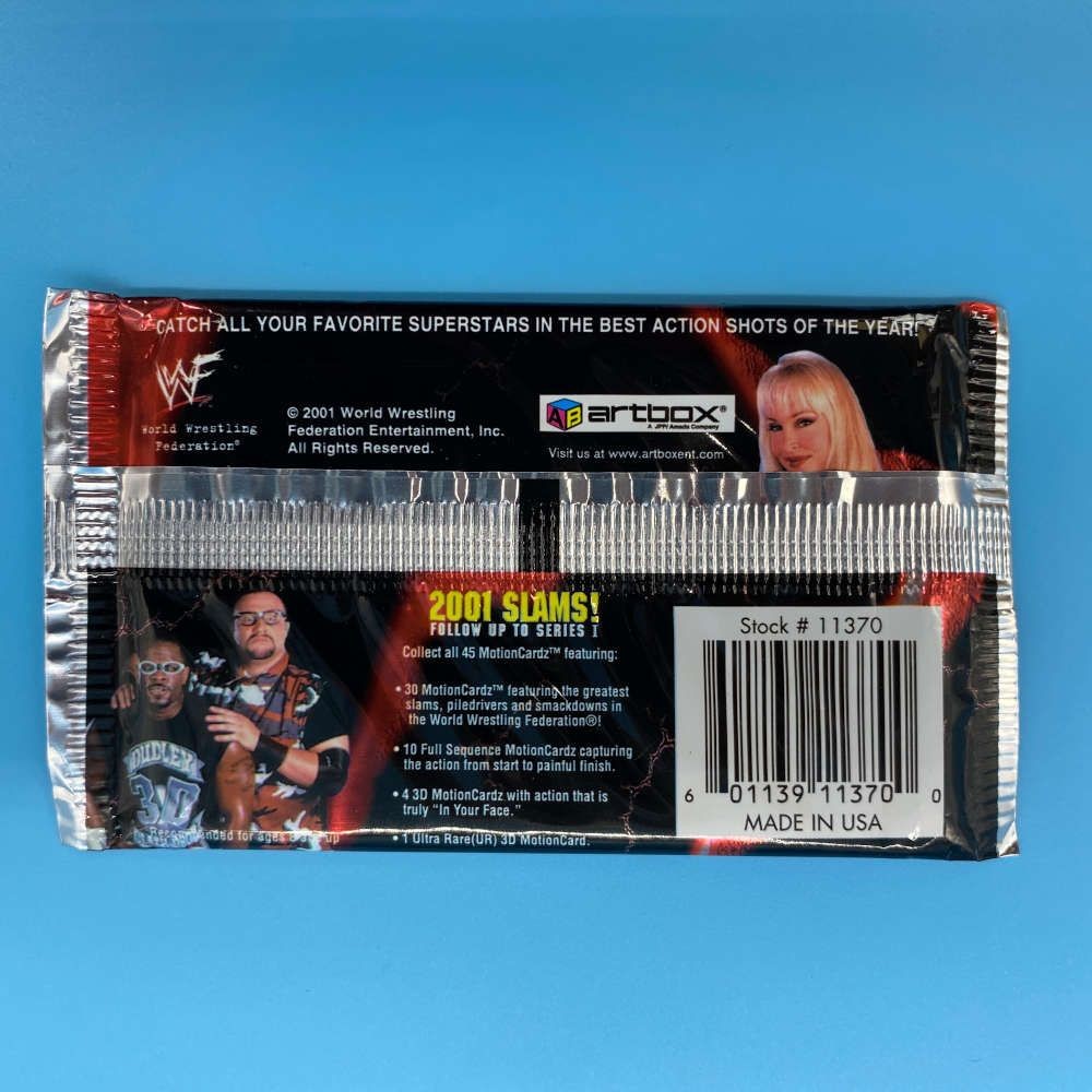 Single packet from WWF Lenticular Motion Cardz: 2001 Slams! by Artbox. Contains 4 motion cards. Some packets have barcode stickers on reverse.