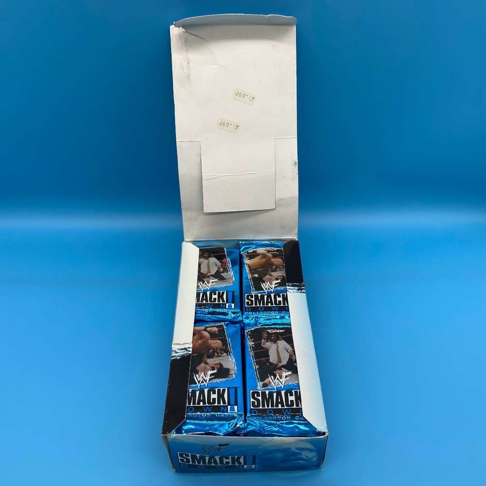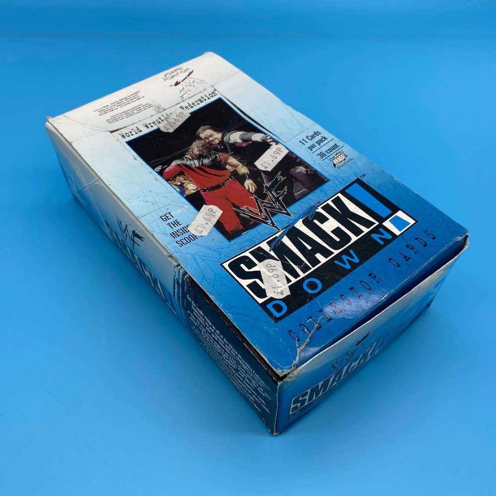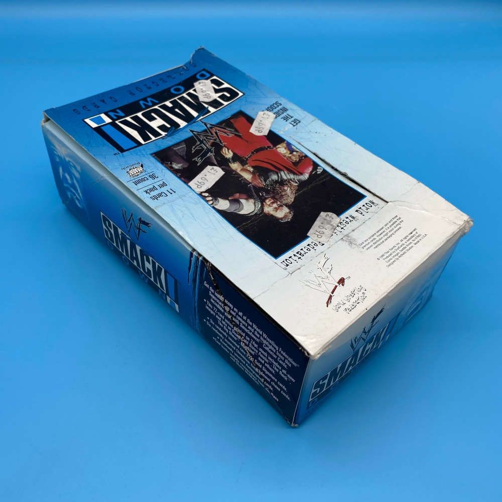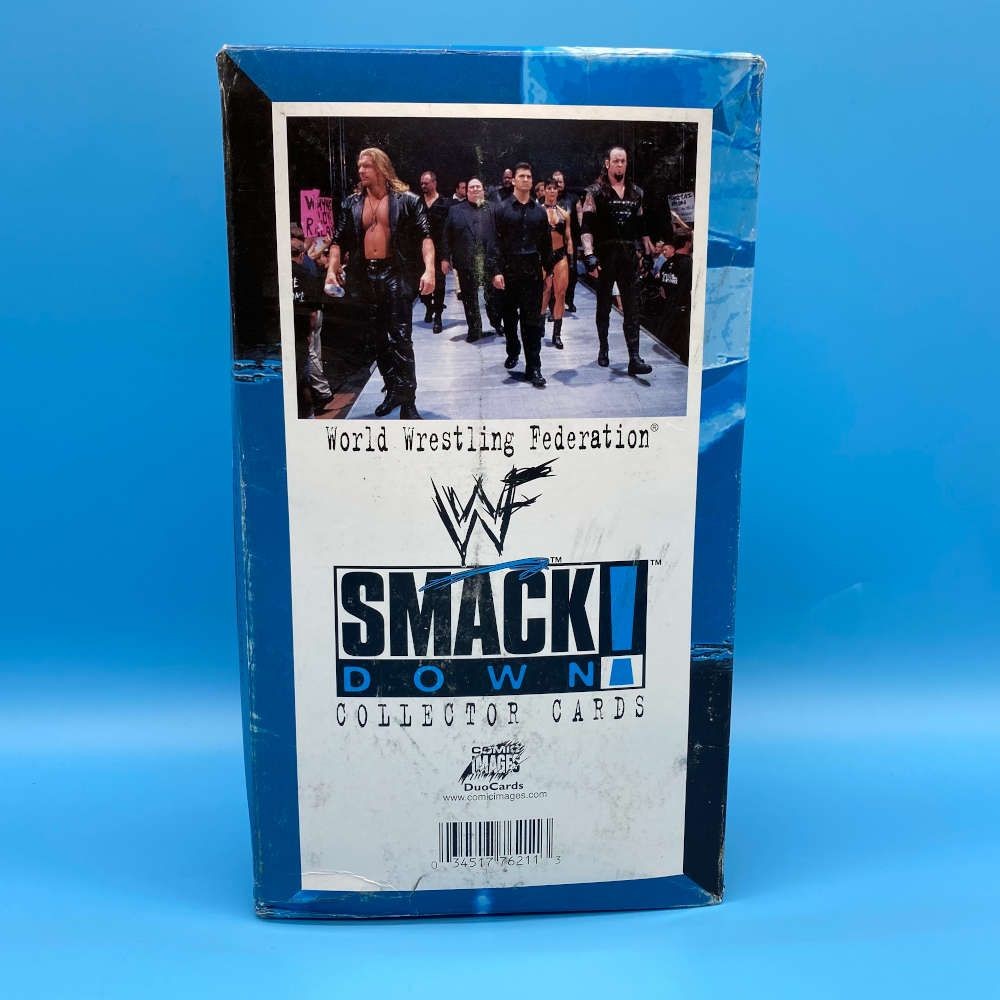 This WWF SmackDown trading cards box was produced by DuoCards (Comic Images subsidiary) in 1999. Each box contains 36 packets with 11 cards per pack. The 72-card base set showcases Superstars from one of wrestling’s most iconic eras, including The Undertaker, The Rock, Stone Cold Steve Austin, Mankind, and The Big Show. Printed on thick 24pt. card stock, this set also features randomly inserted Chromium Smackdown cards, 22kt Gold Signature cards, and Autograph cards. Note: This is shop return stock.